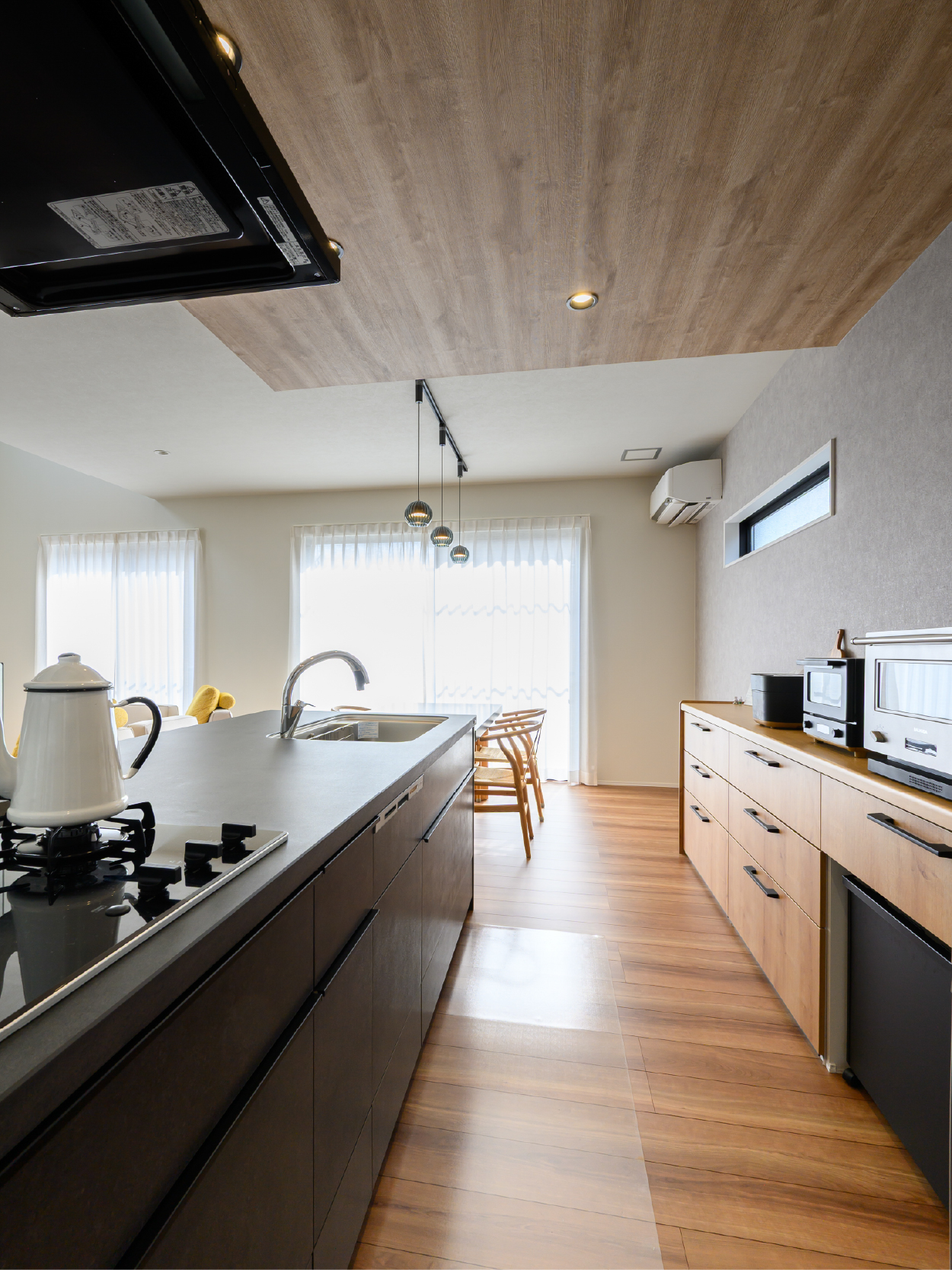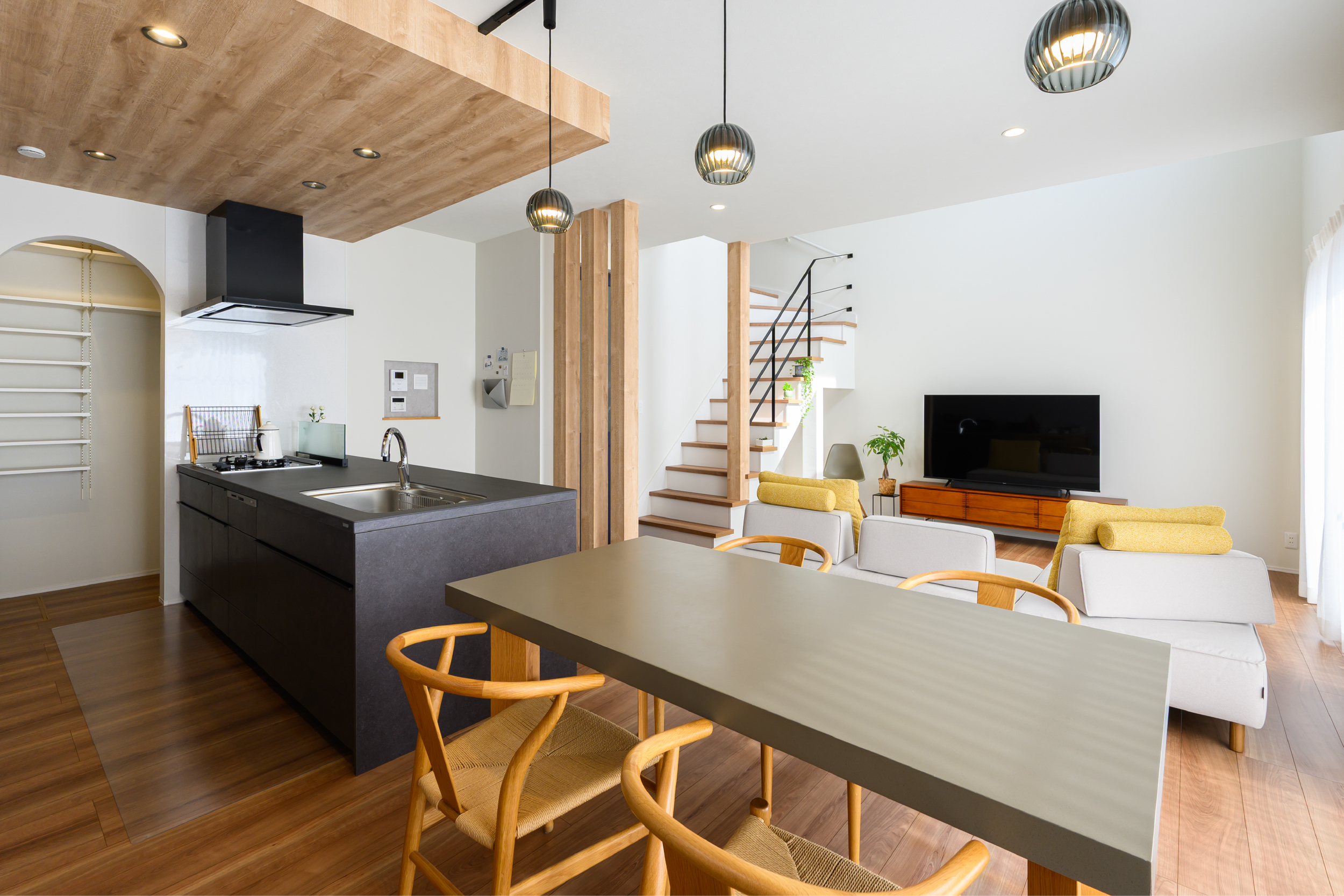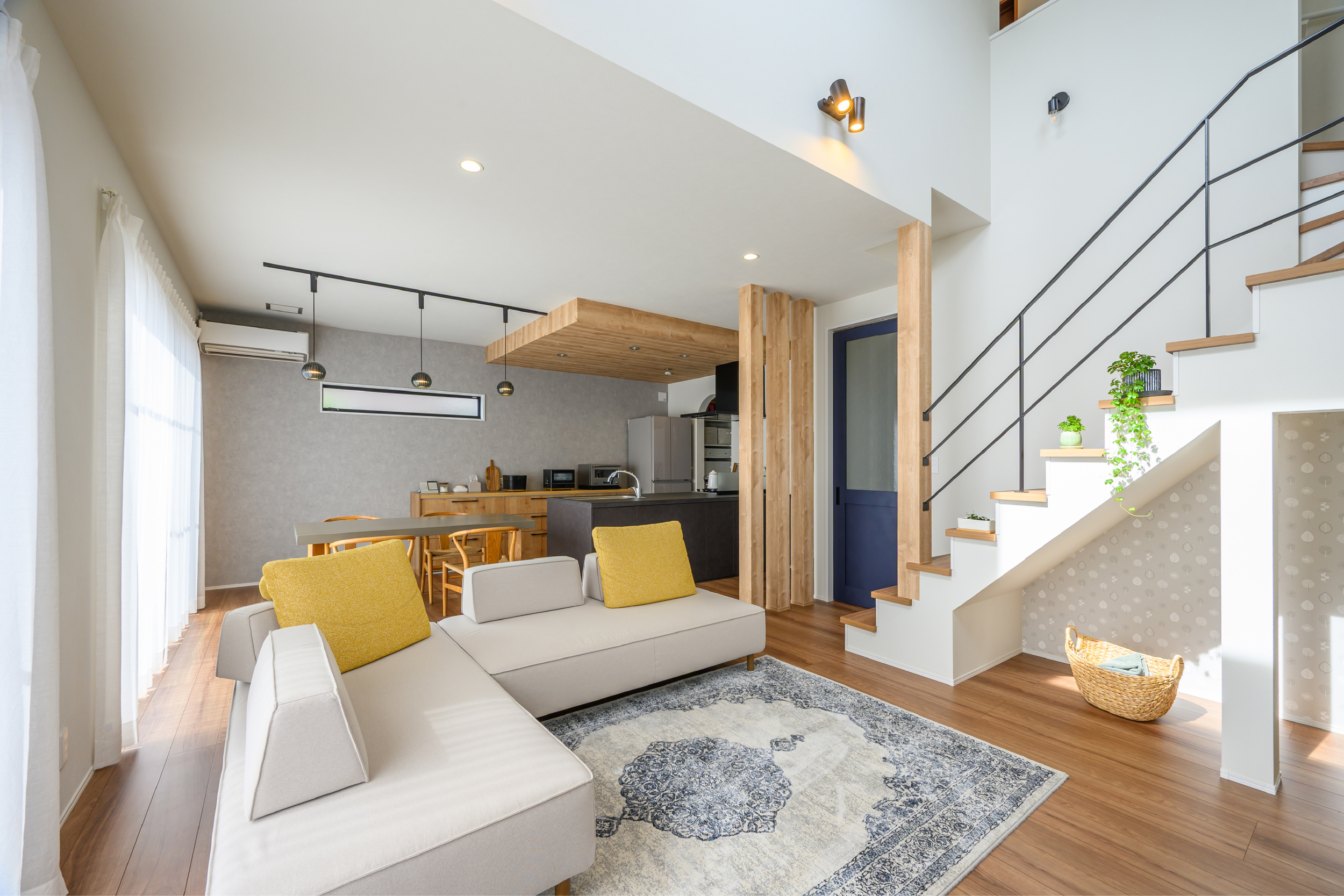 折下げ天井と化粧柱が空間にリズムを生み出し、木のぬくもりをやさしく感じられるLDK。 素材の表情を活かしたデザインが、シンプルながらも印象に残る住まいです。 ゆとりあるキッチンは、家族で並んで立っても窮屈さを感じない広さ。 アクセントとして映える青いドアが、空間全体をほどよく引き締めています。 キッチンからはパントリー、さらに脱衣所へとつながる回遊動線を採用。 家事のしやすさに配慮しながら、デザイン性と暮らしやすさを両立した、心地よい一邸です。