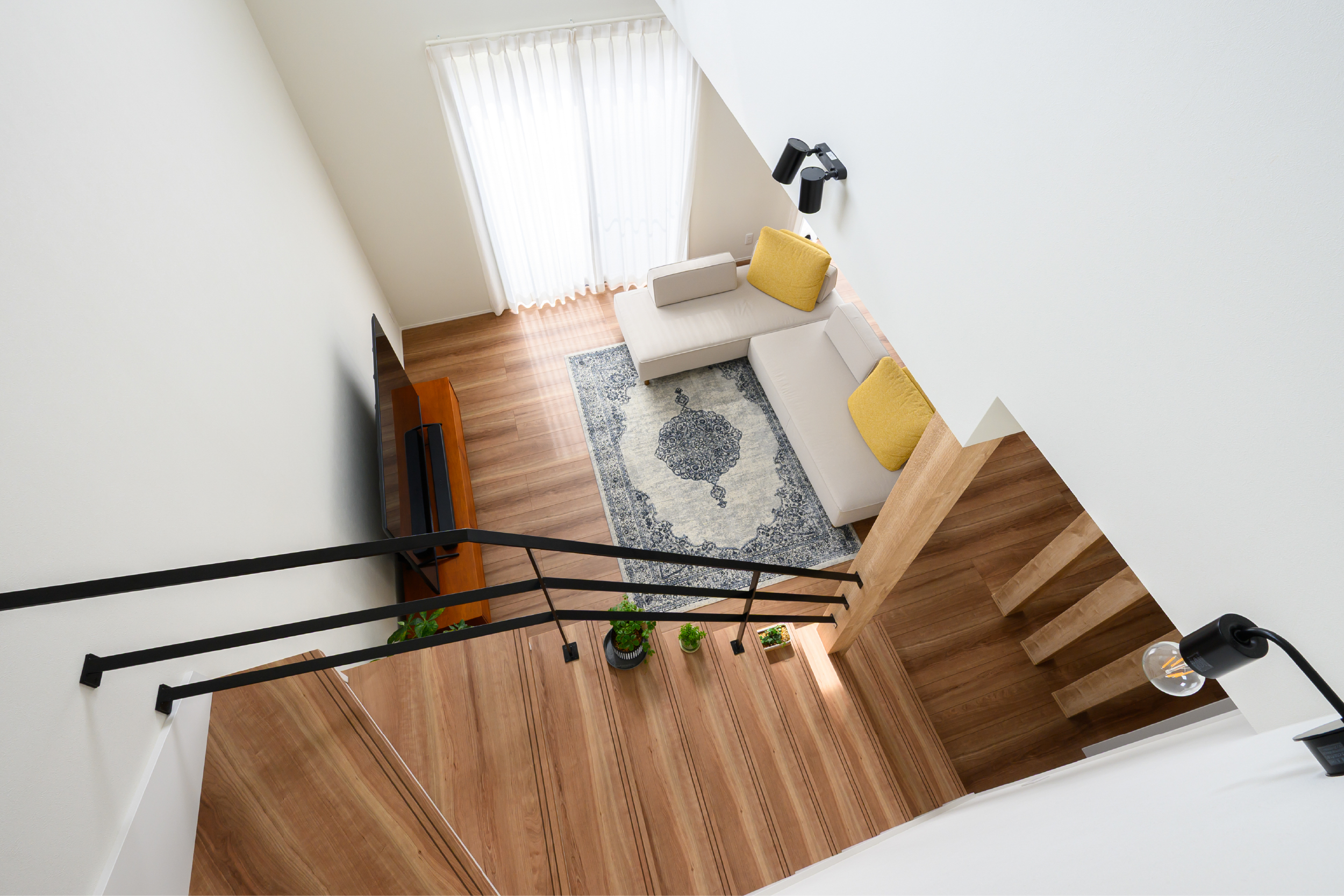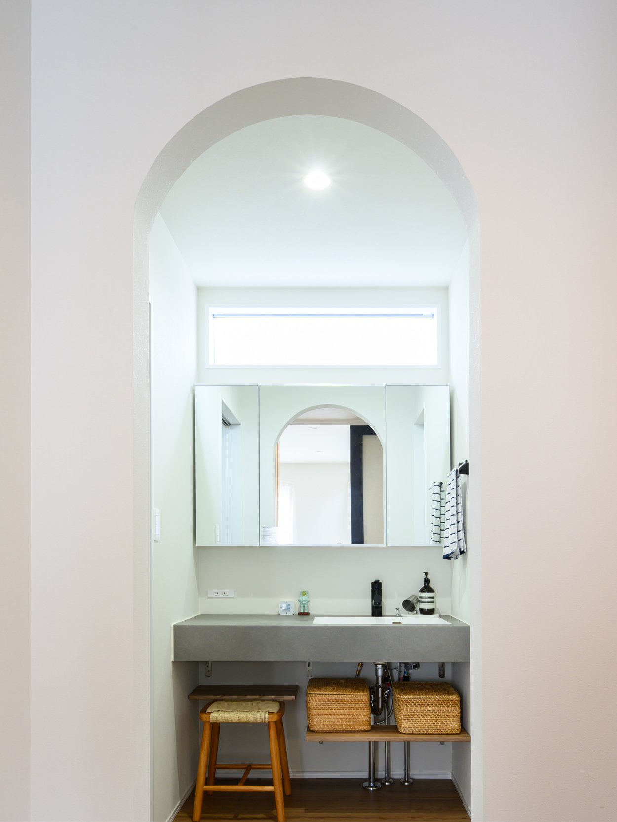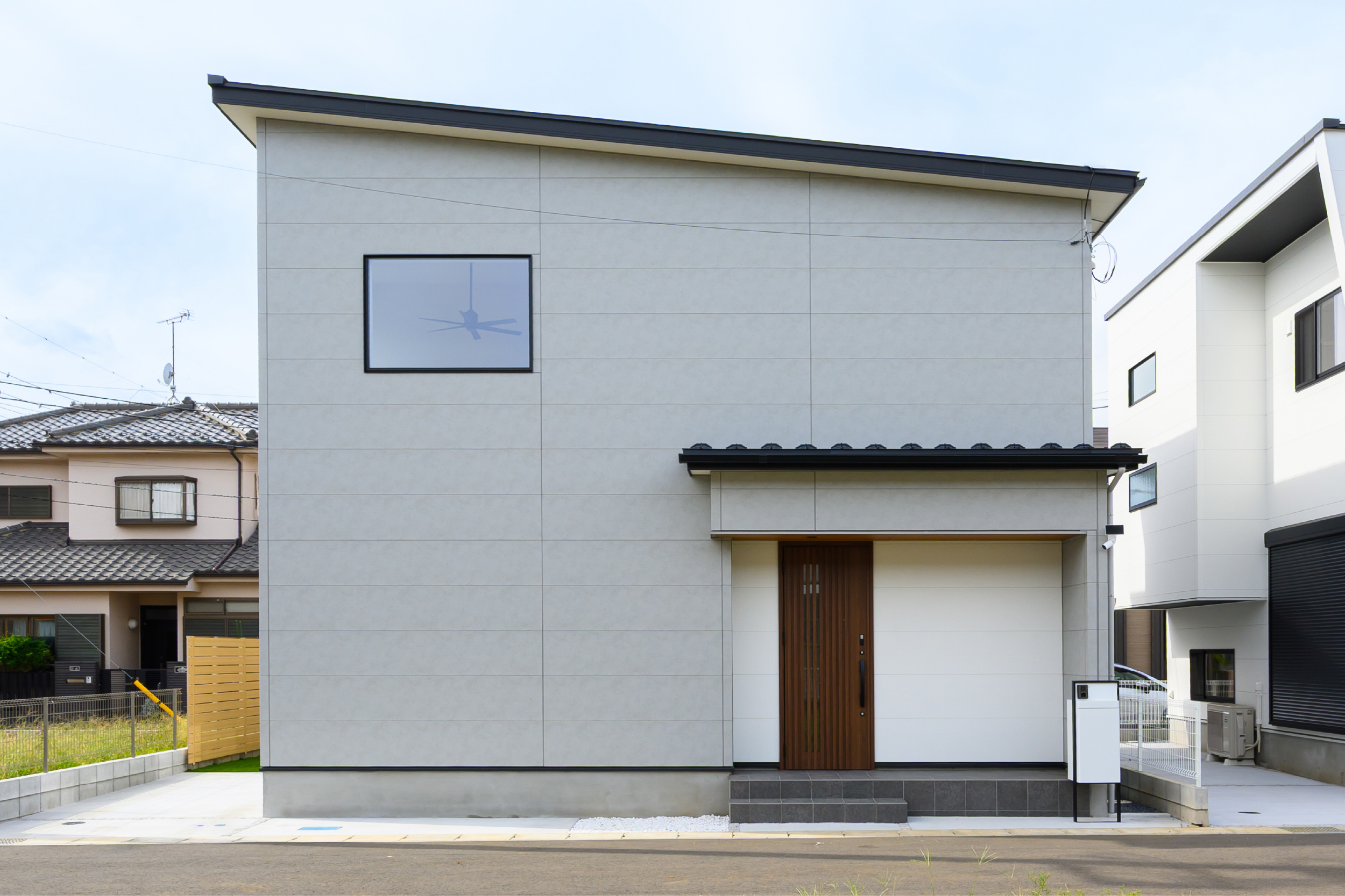 折下げ天井と化粧柱が空間にリズムを生み出し、木のぬくもりをやさしく感じられるLDK。 素材の表情を活かしたデザインが、シンプルながらも印象に残る住まいです。 ゆとりあるキッチンは、家族で並んで立っても窮屈さを感じない広さ。 アクセントとして映える青いドアが、空間全体をほどよく引き締めています。 キッチンからはパントリー、さらに脱衣所へとつながる回遊動線を採用。 家事のしやすさに配慮しながら、デザイン性と暮らしやすさを両立した、心地よい一邸です。